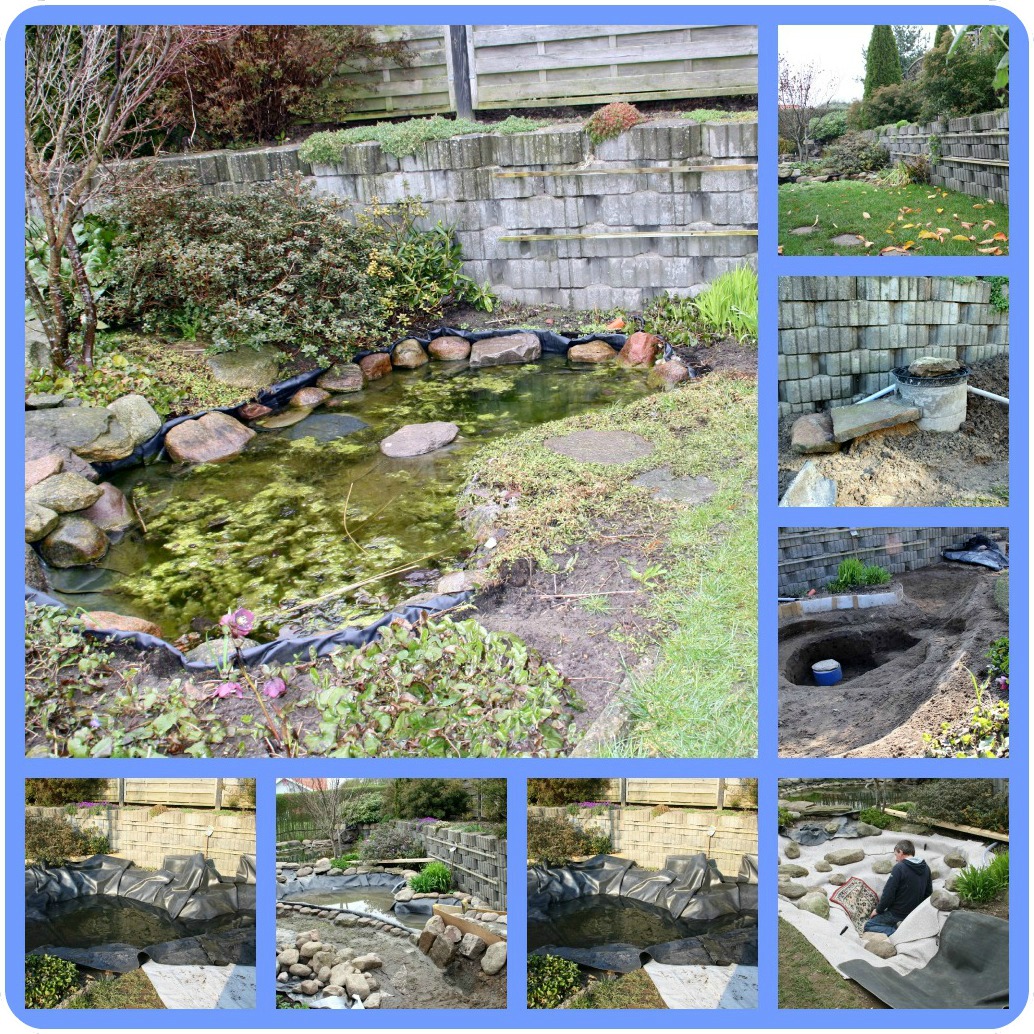 Den lille plumrede dam fik vokseværk og blev dobbelt så stor og meget dybere. Desuden blev der støbt et lille vandfald og installeret pumper.